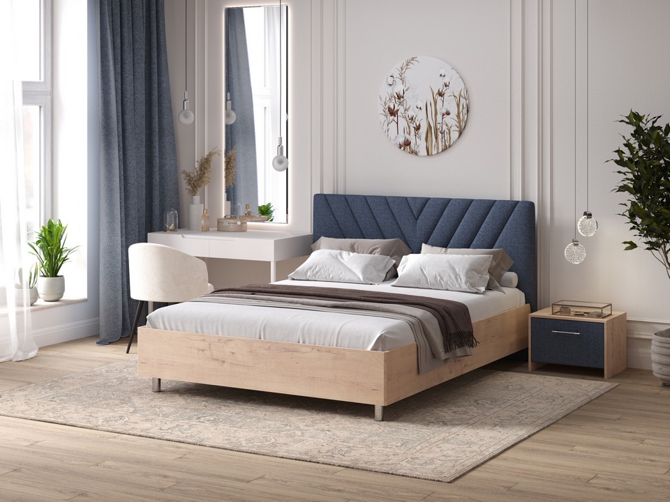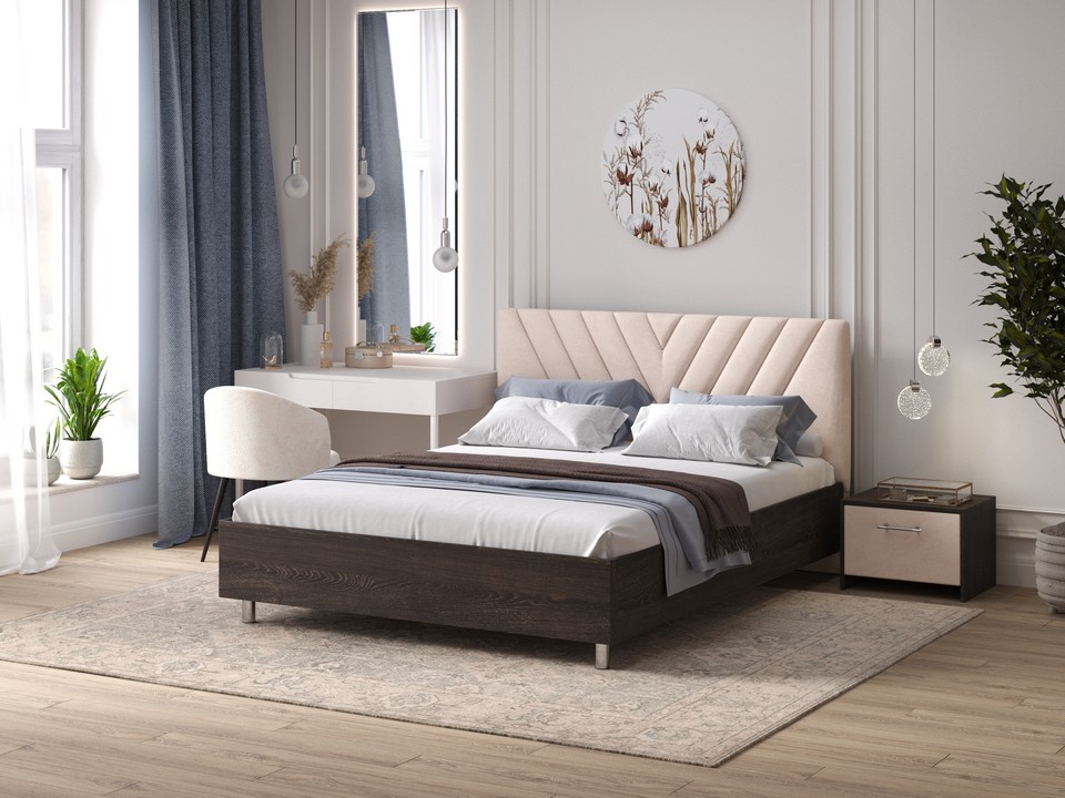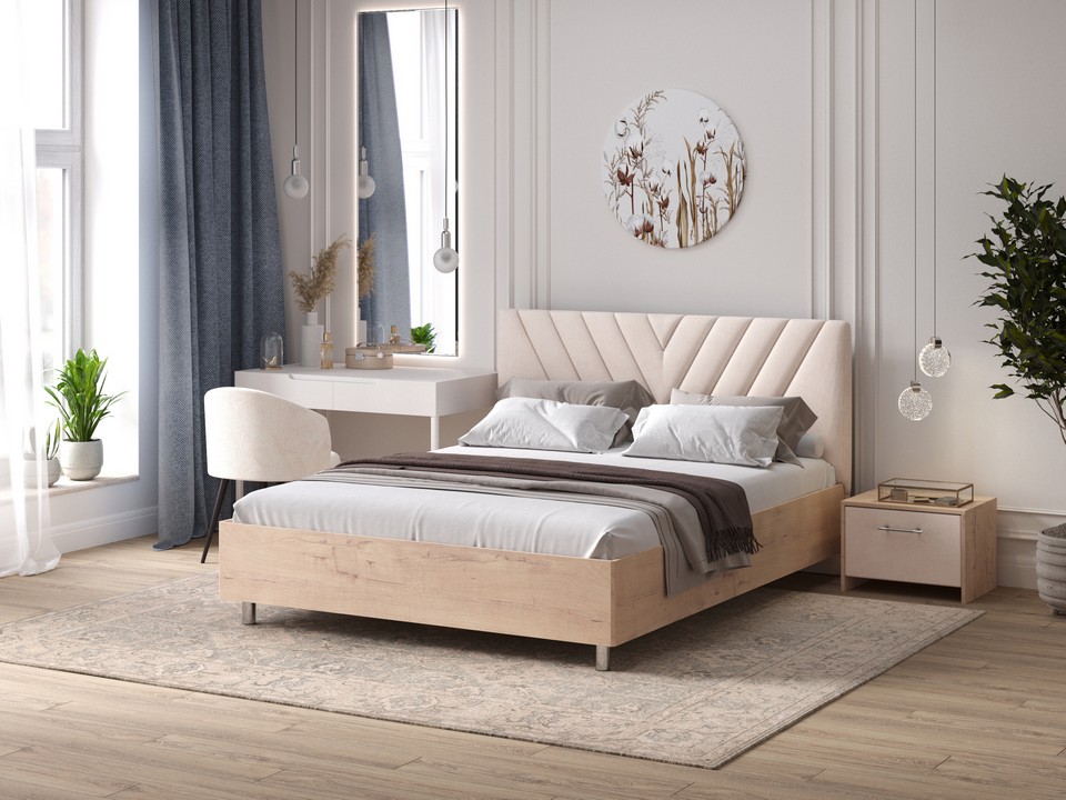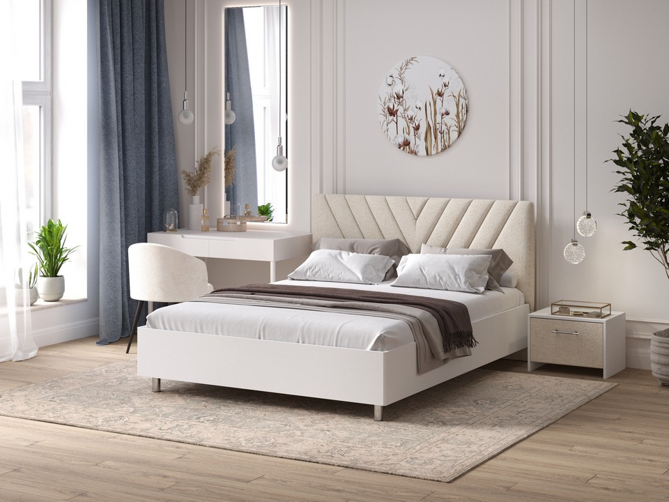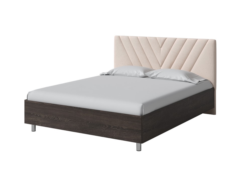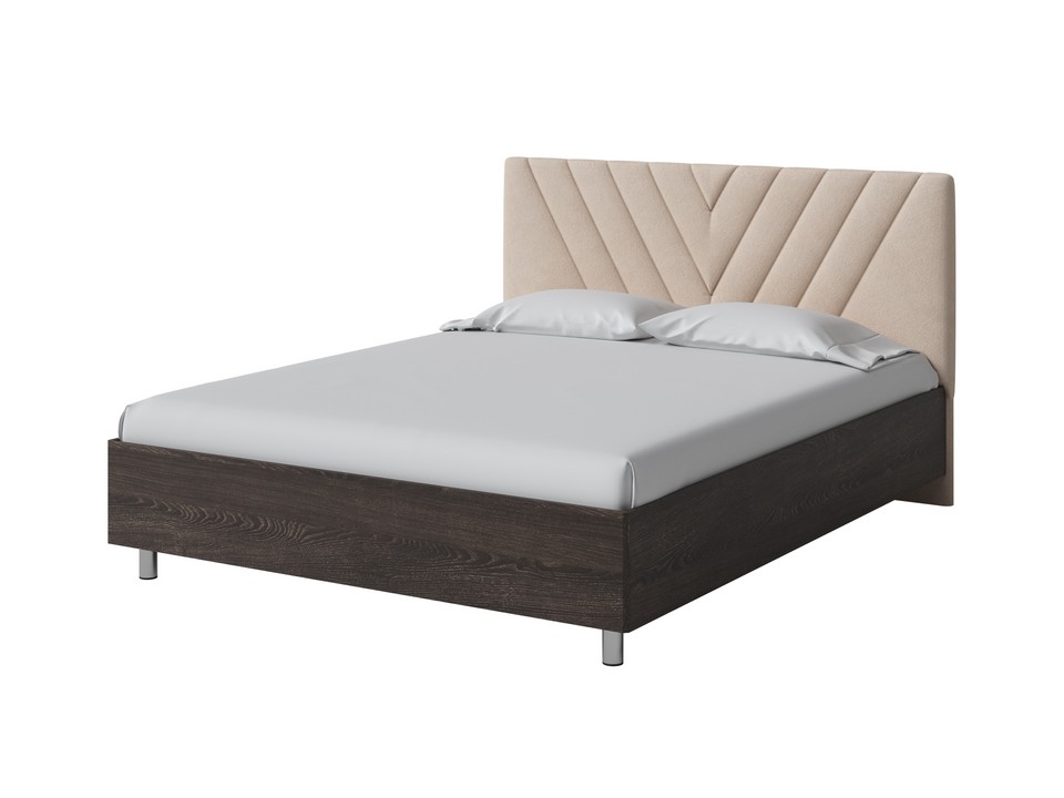 Кровать Ora имеет динамичное мягкое изголовье, изюминкой которого является объемная V-образная стежка.