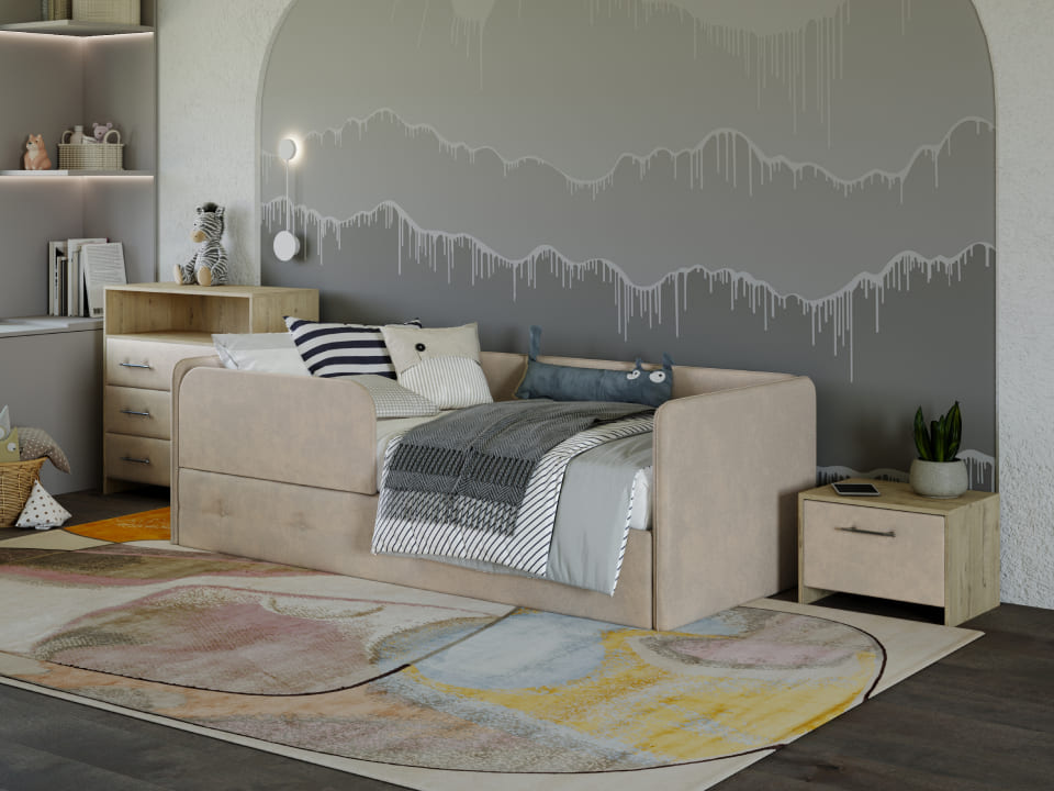 — Кровать Umka может быть дополнена защитным чехлом из основной ткани. Чехол поможет использовать спальное место как диван и минимизирует визуальный шум в комнате.