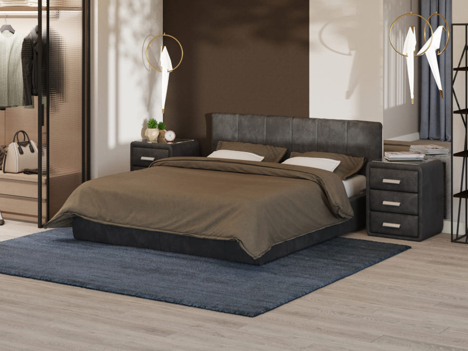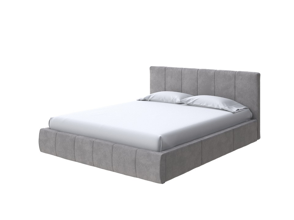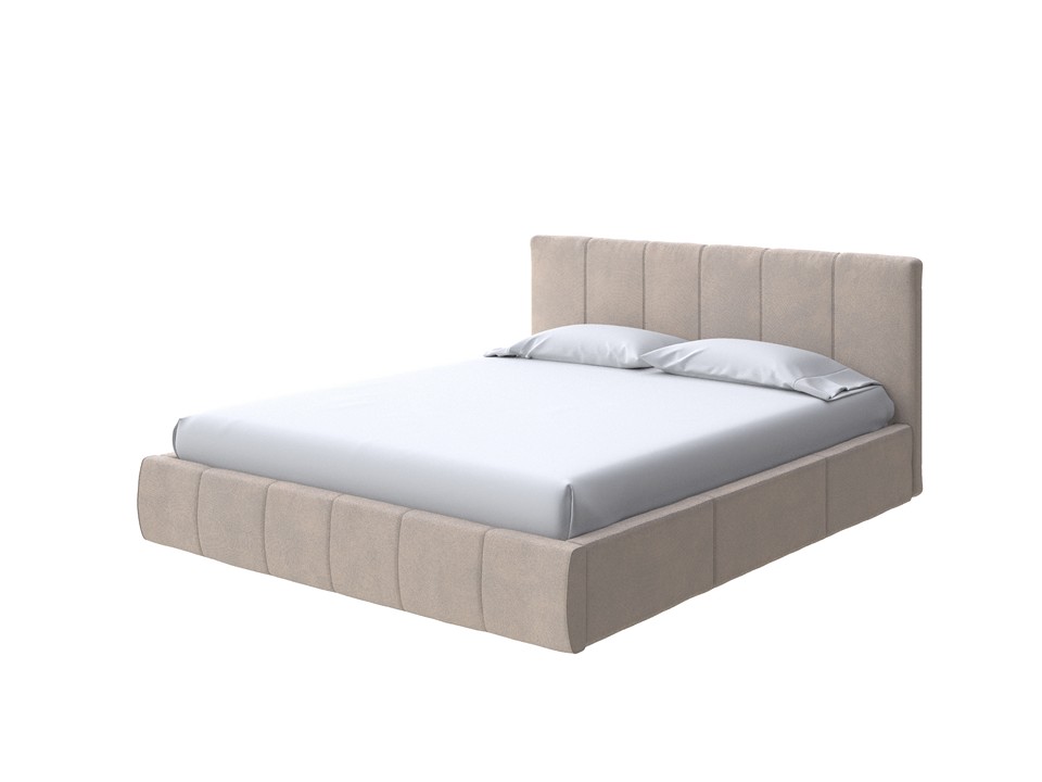 Кровать выполнена в современном дизайне: округлые царги и высокое изголовье с геометричной вертикальной стёжкой.