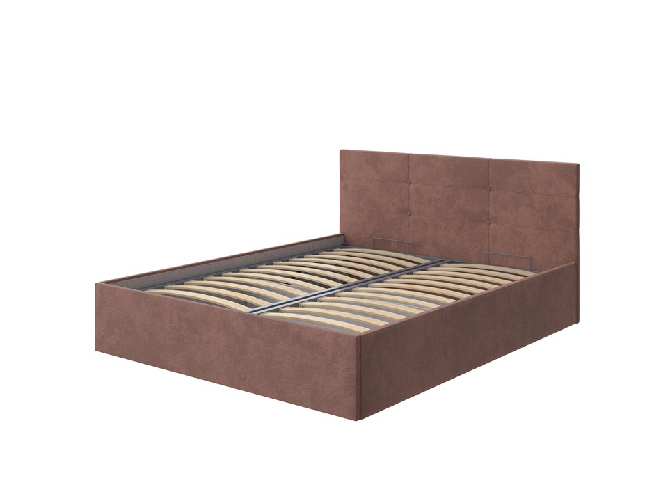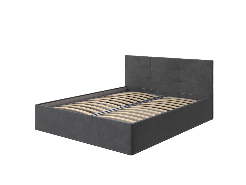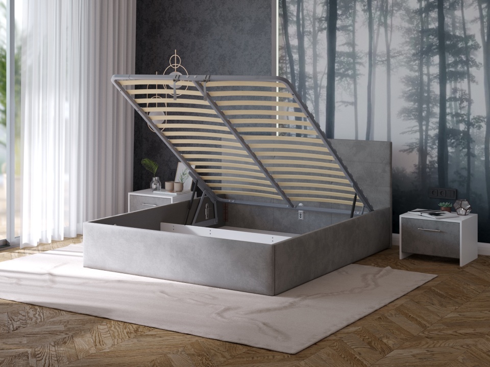 Основание не входит в комплект модели. Металлическое основание и подъемный механизм приобретаются отдельно. Кровать оснащена встроенным бельевым ящиком расположенным на ½ части спального места.